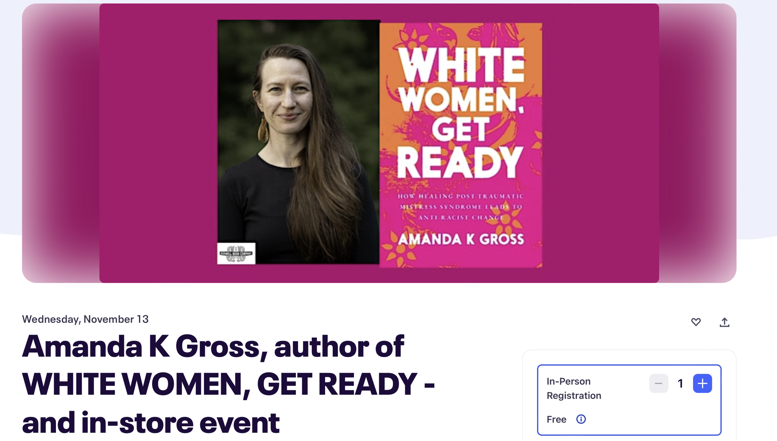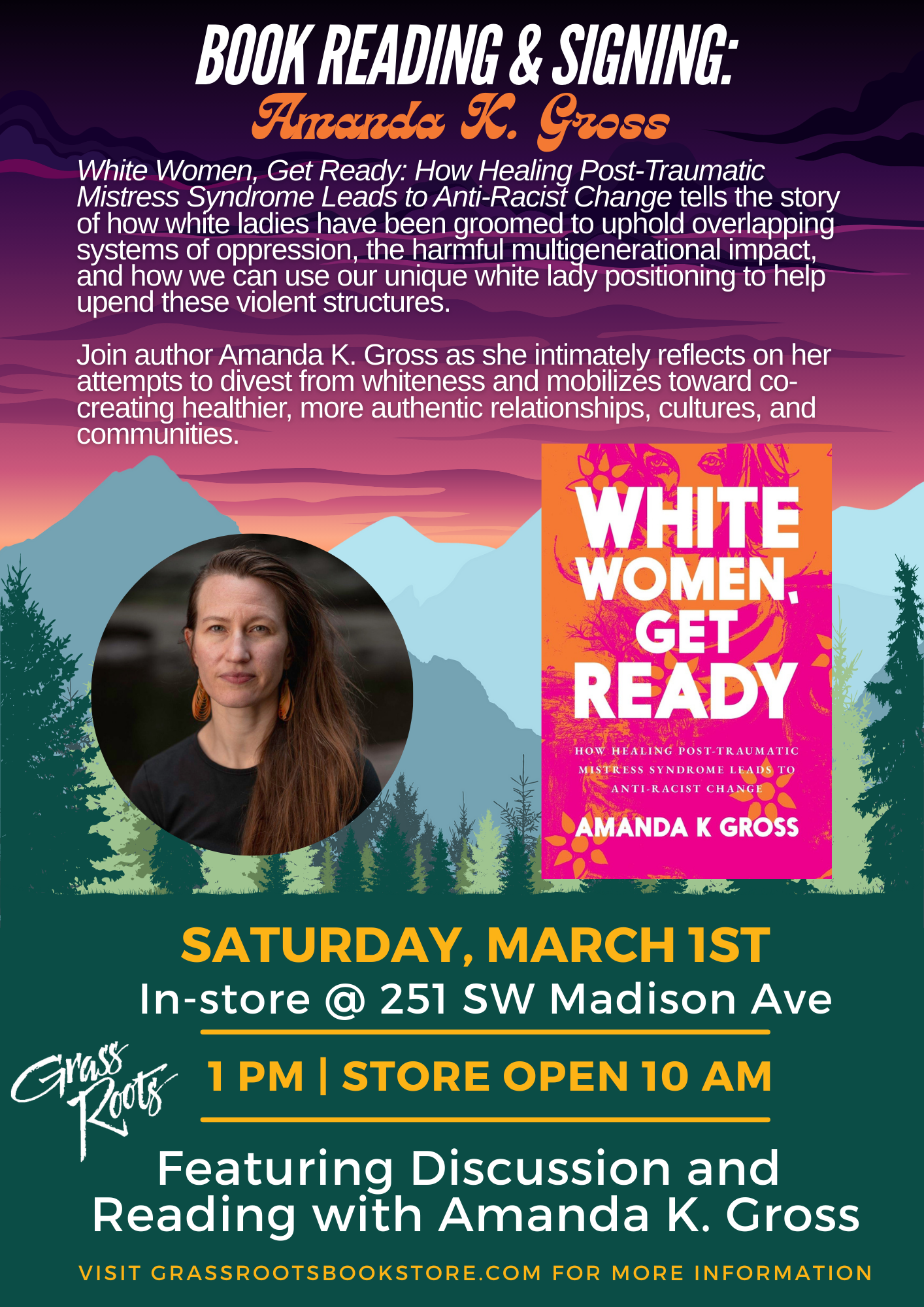 Join us for an author talk and book event focused on White Women, Get Ready: How Healing Post-Traumatic Mistress Syndrome Leads to Anti-Racist Change. Author Amanda K Gross will be offering a brief reading, an embodied tool for anti-racist practice, and time for questions and discussion.