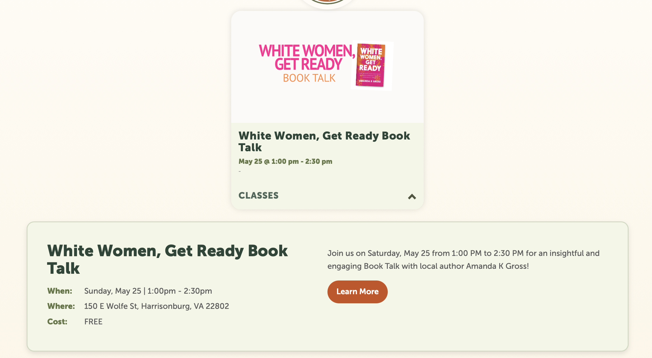 This White Women, Get Ready book talk is free and open to the public hosted by the Harrisonburg Friendly City Food Co-op.