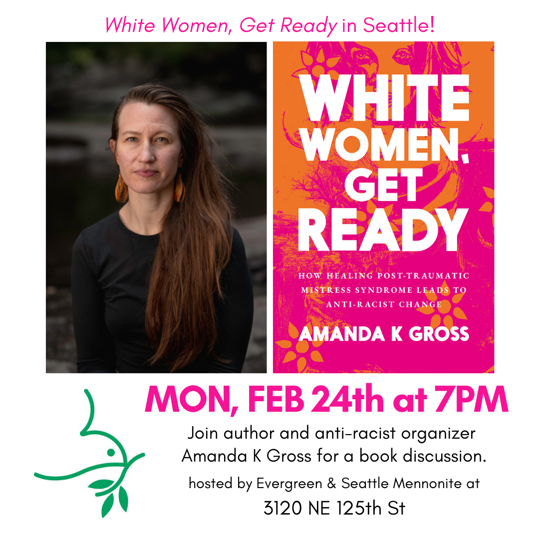 Author, white lady, and Mennonite Amanda K Gross will be preaching at Portland Mennonite Church on Sunday morning March 2nd. Join the congregation for worship at 9:30am, followed by a focused white women affinity small group dialogue at 12noon.